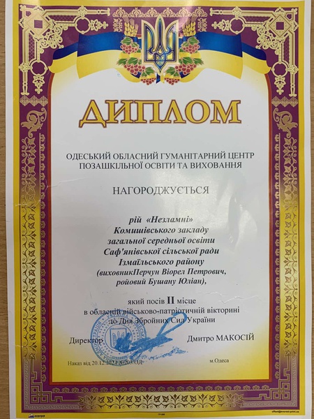 Після опрацювання результатів та згідно протоколу результатів обласної військово-патріотичної вікторини до Дня Збройних Сил України наш рій посів почесне ІІ місце в обласній військово-патріотичній вікторині до Дня Збройних Сил України (наказ Одеського обласного гуманітарного центру позашкільної освіти та виховання від 20.12.2024 №203/ОД). Вихованці рою «Незламні» були нагородженні Дипломом Одеського обласного гуманітарного центру позашкільної освіти та виховання та отримали цінні призи (футболки з емблемою гри «Сокіл» («Джура») (виховник Перчун Віорел Петрович, ройовий Бушану Юліан).